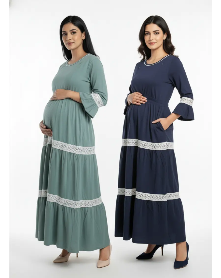 Pack of 2-Women 3/4th Sleeves Ultra Soft Cotton Maternity Maxi-Blue,Sage Green